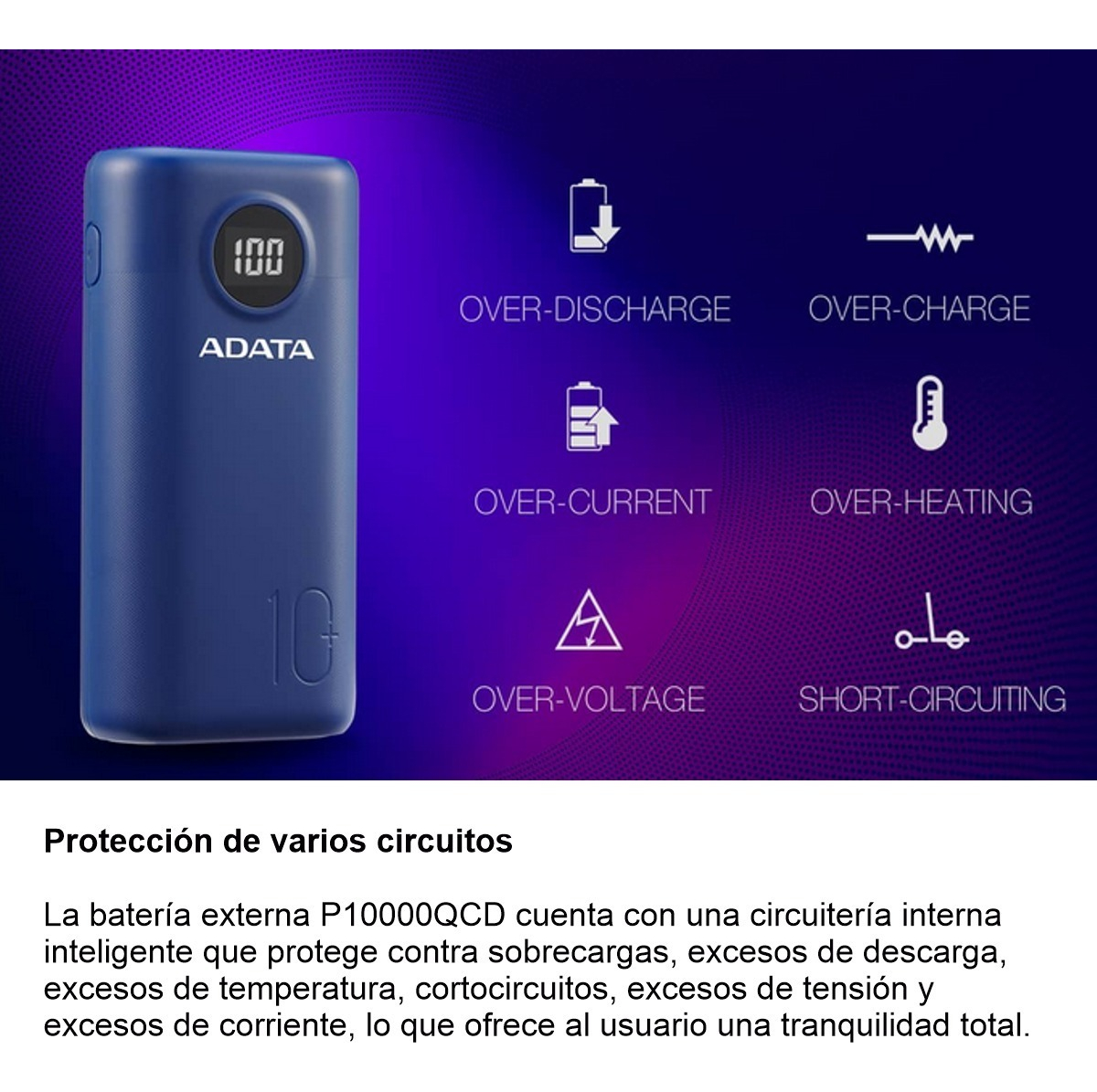 La batería externa P10000QCD cuenta con una circuitería interna inteligente que protege contra sobrecargas, excesos de descarga, excesos de temperatura, cortocircuitos, excesos de tensión y excesos de corriente, lo que ofrece al usuario una tranquilidad total.