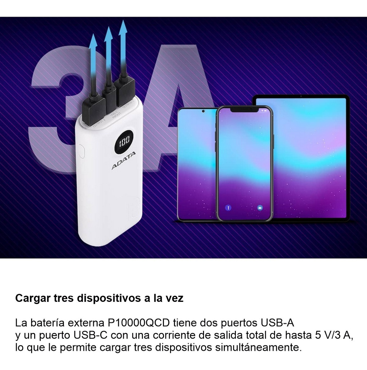 La batería externa P10000QCD tiene dos puertos USB-A y un puerto USB-C con una corriente de salida total de hasta 5 V/3 A, lo que le permite cargar tres dispositivos simultáneamente.