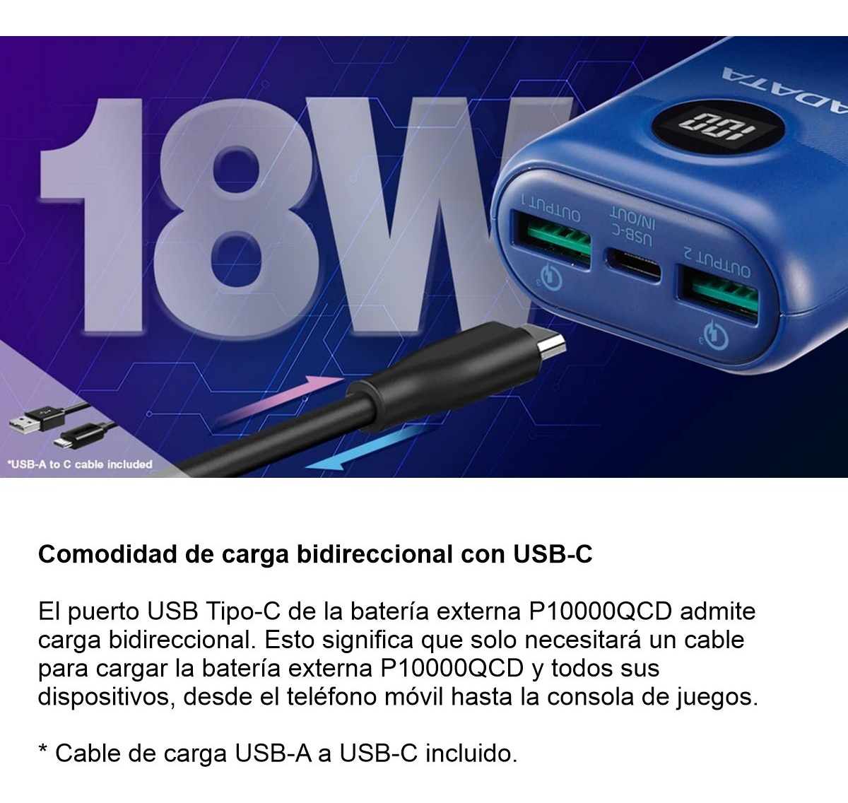 2. Cuando utilice una batería externa de ADATA para cargar los dispositivos USB-C, utilice el cable original del dispositivo para realizar una carga óptima.