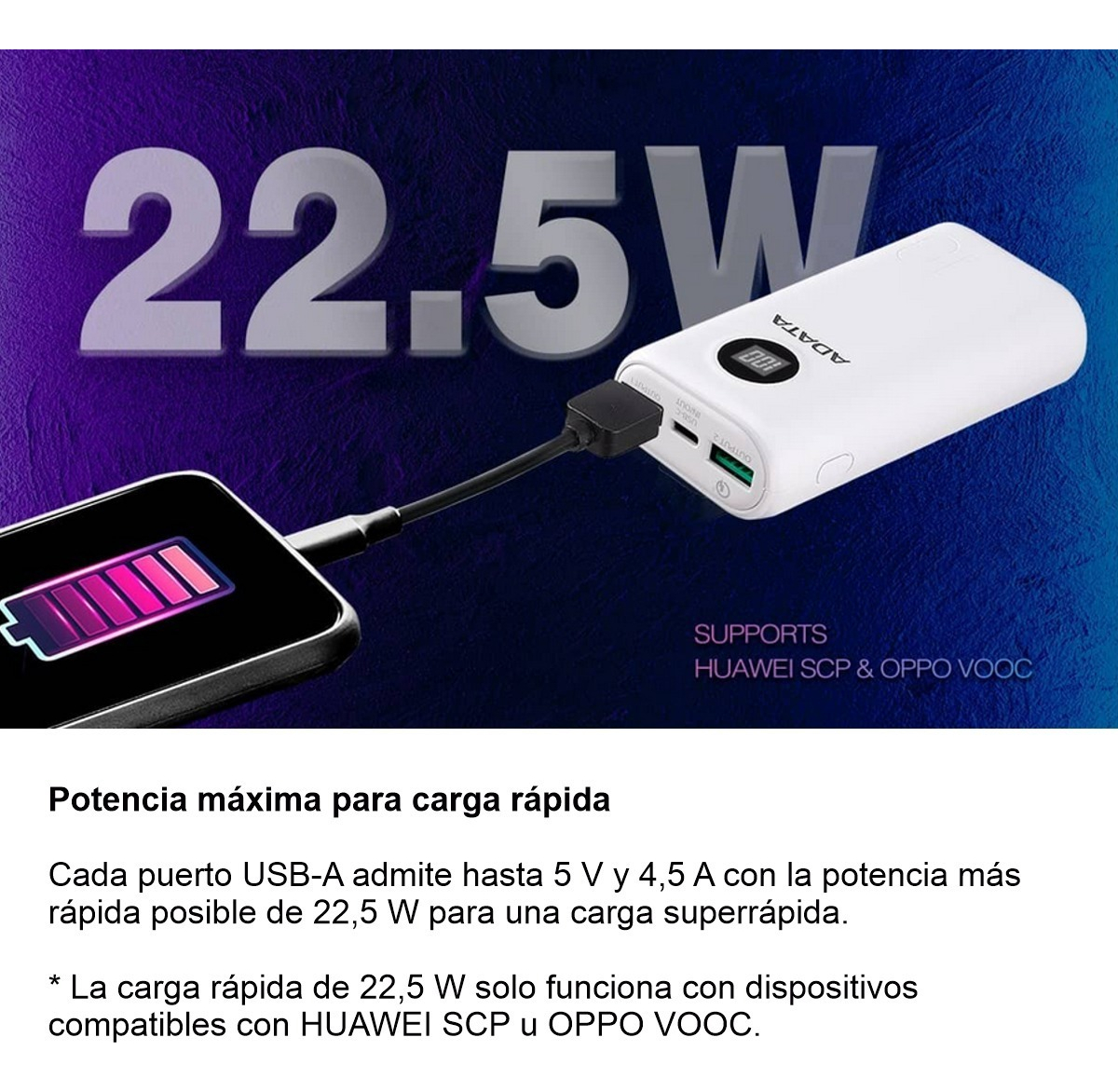 * La carga rápida de 22,5 W solo funciona con dispositivos compatibles con HUAWEI SCP u OPPO VOOC.