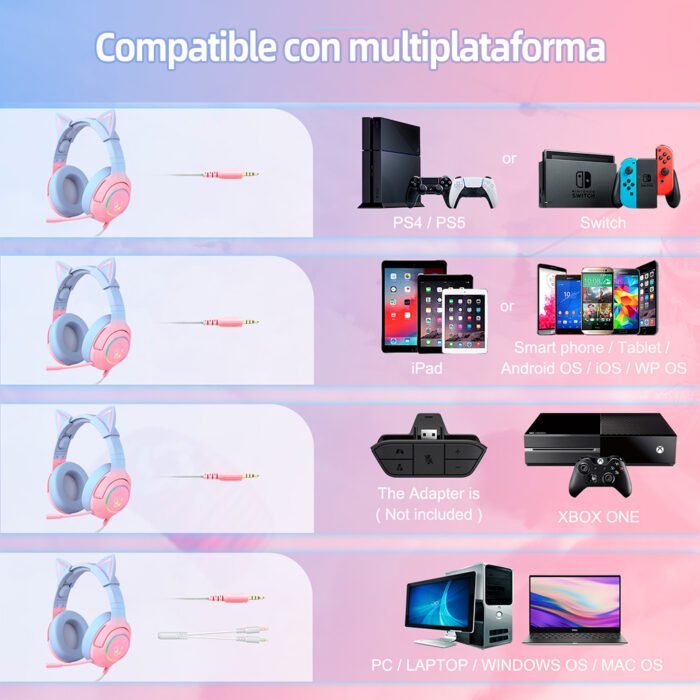 Los auriculares para juegos de color rosa se pueden emparejar fácilmente con PS4, PS Vita, computadora portátil, PC, tabletas, teléfonos inteligentes, Nintendo y varios otros modelos. También puede conectarlos con Xbox, sin embargo, si posee un modelo anterior, es posible que necesite un adaptador (no incluido) para conectarlos. Tiene un conector de audio de 3,5 mm que permite a los usuarios conectar los auriculares con los dispositivos.