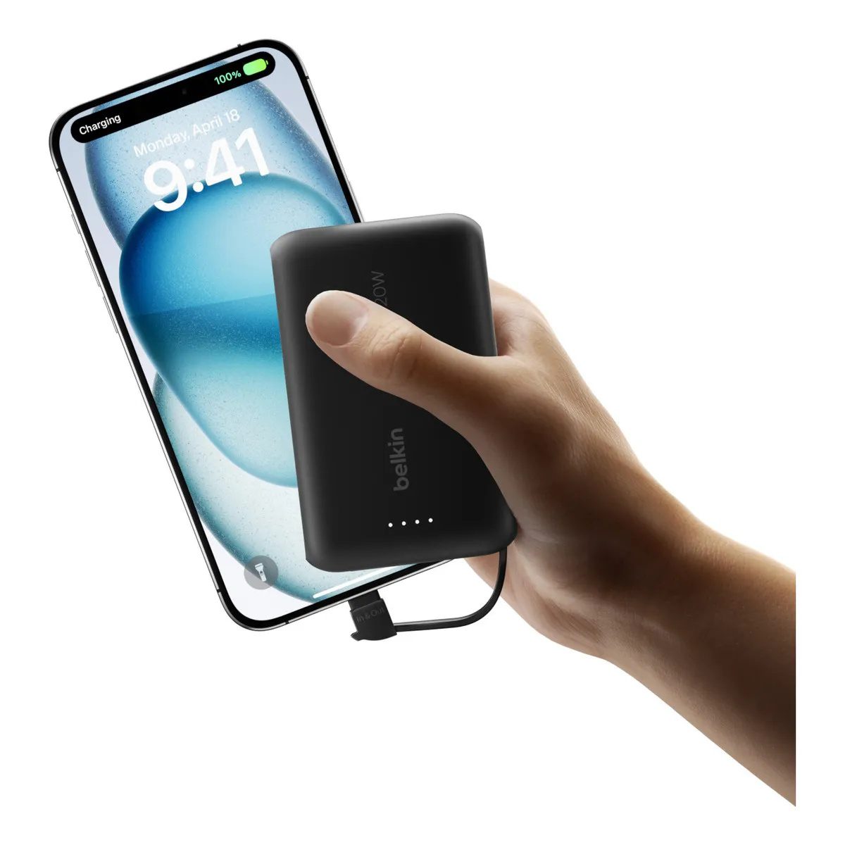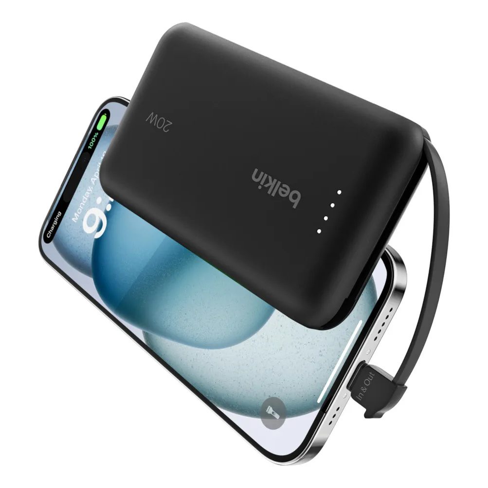 Carga hasta 20 W con nuestra ligera batería externa de 10.000 mAh. Su diseño con cable USB- C® integrado ofrece una cómoda experiencia de carga rápida en cualquier lugar, sin necesidad de cable. Un puerto USB-C permite cargar un segundo dispositivo simultáneamente.