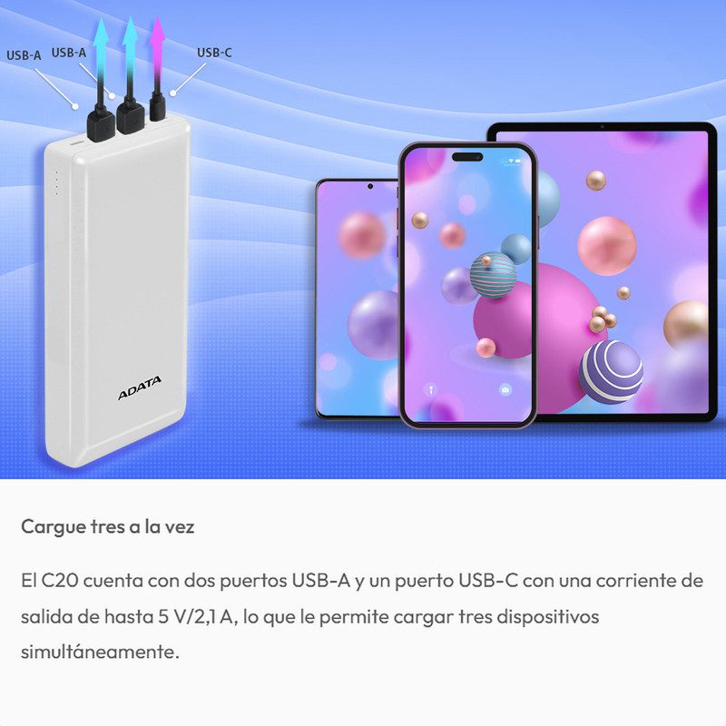 El C20 cuenta con dos puertos USB-A y un puerto USB-C con una corriente de salida de hasta 5 V/2,1 A, lo que le permite cargar tres dispositivos simultáneamente.