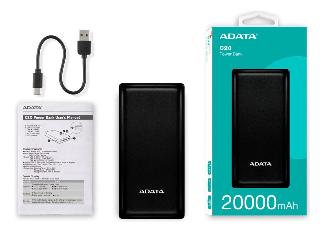 CARGADOR PORTÁTIL POWER BANK 20000MAH, ADATA C20